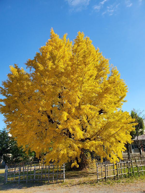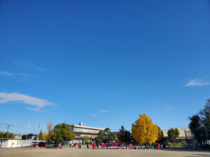 校庭の銀杏が見事に色づいて青空に映えてます。